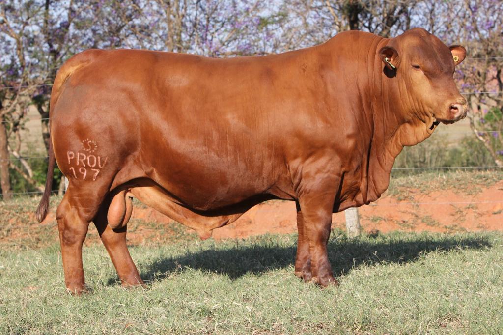 PROV 0197 é um reprodutor que apresenta estrutura forte e elevada abertura de costela, com perfil de qualidade de carcaça moderna, de conformação cilíndrica e ótimas passagens, dando harmonia ao reprodutor.