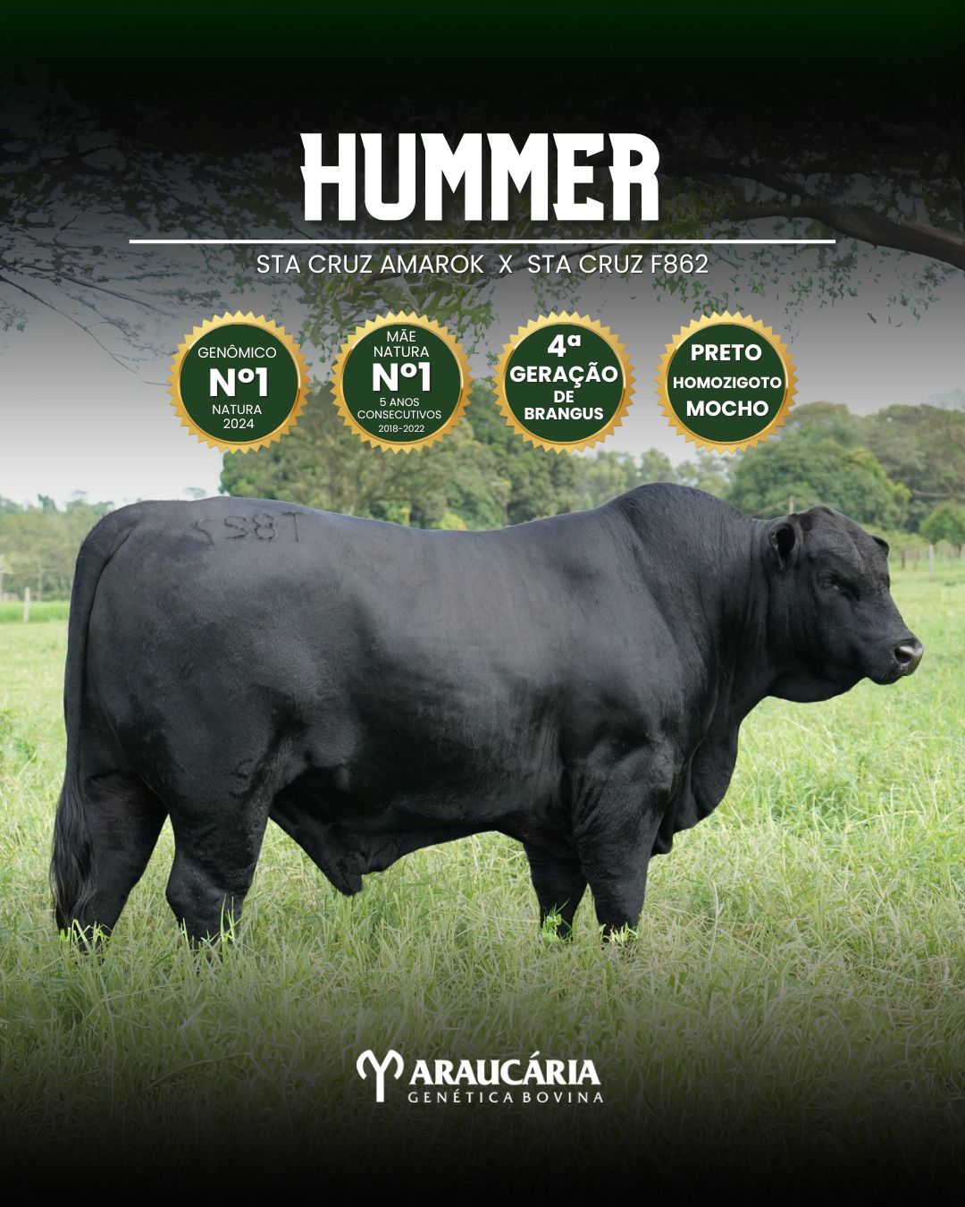 Tem genética muito consistente, filho de Sta Cruz Amarok, linhagem americana fechada e também Líder do Sumário Natura, com a grande matriz Sta Cruz F862, outra Líder absoluta do Sumário Natura por 5 anos consecutivos (2018 a 2022) com mais de 90 filhos avaliados.