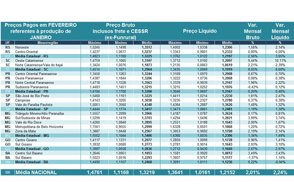 Além do Cepea, outros indicadores confirmaram tendência de ligeira alta nos preços pagos aos produtores em fevereiro. Dados parciais do MilkPoint Radar, atualizados até o dia 19 de fevereiro (veja versão mais atualizada na página seguinte, fornecida no fechamento da edição), apontam um preço líquido médio de R$ 1,4537/litro neste mês, R$ 0,02 maior do que o de janeiro para o mesmo grupo de produtores participantes do aplicativo. Segundo o levantamento, o mercado atual apresenta uma tendência de alta para os preços em todas as faixas de produção, sendo que os produtores com maior volume continuam a ganhar mais em média pelo litro de leite.