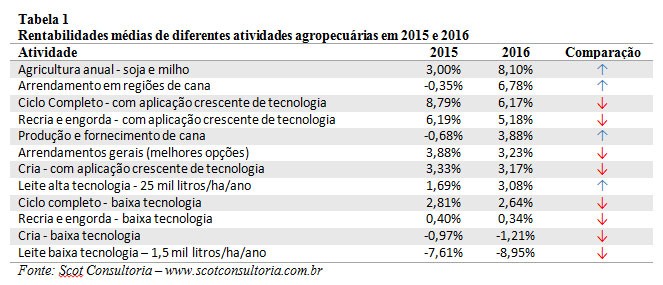 Comparando a média de 2016, em relação a 2015, o preço do leite ao produtor subiu 17,5% em valores nominais, no entanto, os custos de produção subiram, em média, 21% no mesmo período, segundo a consultoria. A rentabilidade média da atividade de alta tecnologia subiu de 1,69% em 2015 para 3,08% em 2016. Já a pecuária leiteira de baixa tecnologia amargou mais um ano de prejuízo. Este foi o quinto ano consecutivo de rentabilidade negativa. Foi o pior resultado dentre as atividades agropecuárias analisadas.